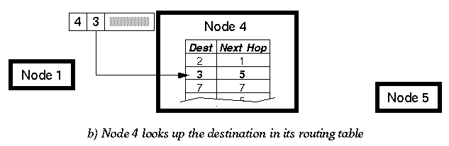 Figure 2.1 illustrates the routing procedure in DSDV. In this example, a packet is being sent from node 1 to node 3 (node 3 is not shown). From node 1, the next hop for the packet is node 4 (Figure 2.1 a). When node 4 receives the packet, it looks up the destination address (node 3) in its routing table (Figure 2.1 b). Node 4 then transmits the packet to the next hop as specified in the table, in this case node 5 (Figure 2.1 c). This procedure is repeated as required until the packet finally reaches its destination.