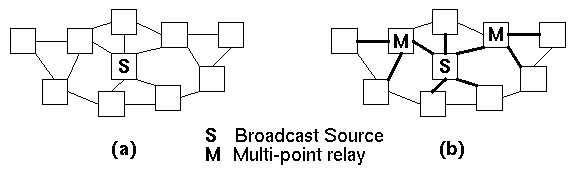The novel attribute of OLSR is its ability to track and use multi-point relays. The idea of multi-point relays is to minimize the flooding of broadcast messages in the network by reducing/optimizing duplicate re-transmissions in the same region. Each node in the network selects a set of nodes in its neighborhood who will re-transmit its broadcast packets. This set of selected neighbor nodes is called the multi-point relays of that node. Each node selects its multi-point relay set in a manner to cover all the nodes that are two hops away from it. The neighbors which are not in the multi-point relay set still receive and process broadcast packets but do not re-transmit them. Figure 6.1 illustrates an example of multi-point relay versus regular broadcasting in a network of 10 nodes.